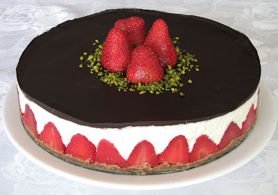 Legalább 2 óra elteltével vízgőz felett felolvasztom a csokoládét, lágyítom egy kevés szűz dióolajjal (vagy sima, napraforgó olajjal) - ettől krémesebb lesz a máz - majd rácsurgatom a már megdermedt túrótortára. Újabb órányi hűtés után előveszem a konyhai gázpisztolyom és gyorsan körbemelegítem vele a torta oldalát, így az könnyen és „balesetmentesen” leválasztható (gázpisztoly hiányában akár egy gyertyával is körbemelegíthető, vagy meleg késsel, egyszerűen körbevágom a tortaforma belső falánál és elválasztom tőle) . Tányérra csúsztatom a tortát, tetejét natúr pisztáciával és eperrel díszítem.